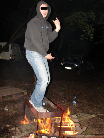 Večer ohen a vohen. Petr vytahuje Capitána, nu, proč ne, dáváme ho elitně rychle, tož mám tu ještě litr rumíka Božkovíka, ten padá, začínáme bejt divocí, rozděláváme vatru, pomazáváme Plamenovi jeho nové WV blátem, lopatou, košťátkem, kvalita, žerem další rum, překlopka přes ohen, kdo to dá, nacházíme starý gril, rozpalujem ho do červena,kdosi do něj leze, a za mohutného podlejvání pivem grilujem jeho tenisky…