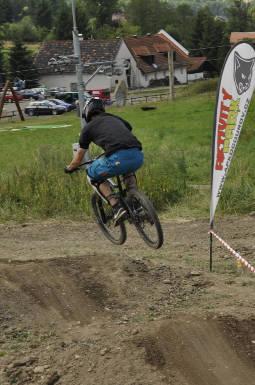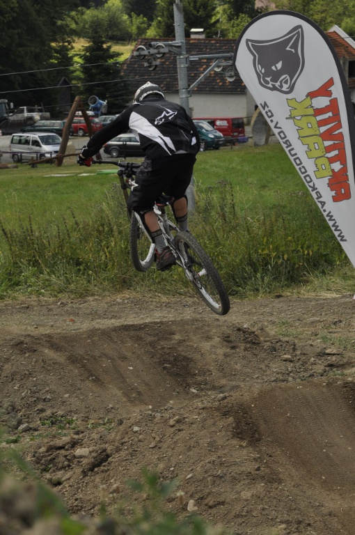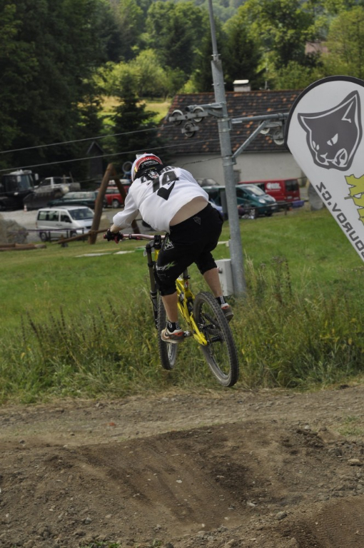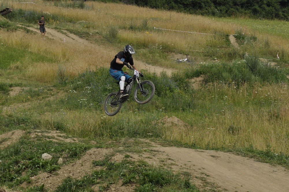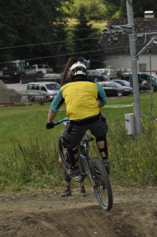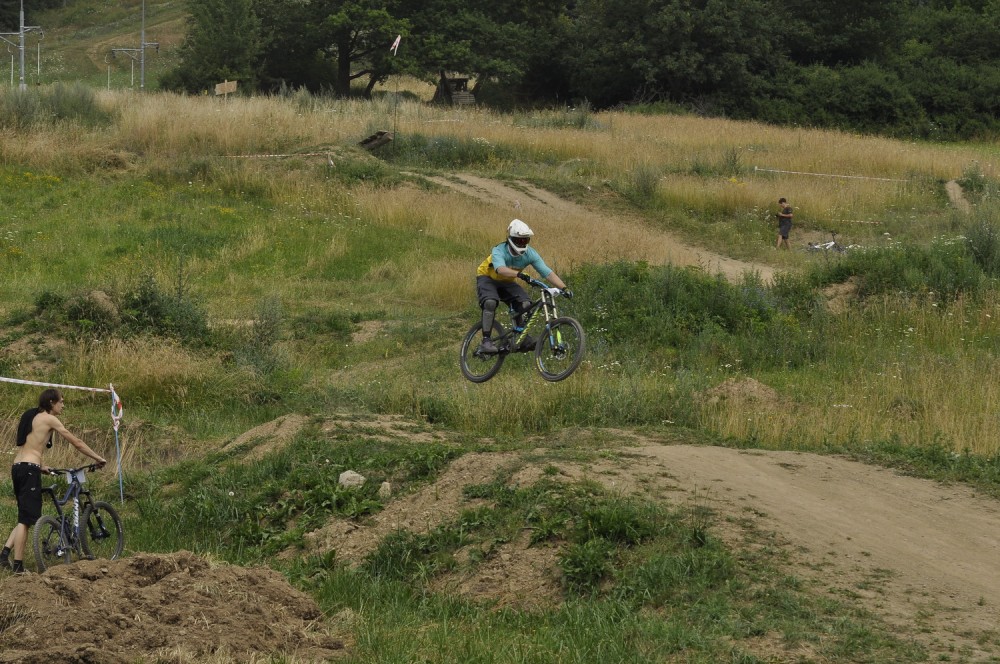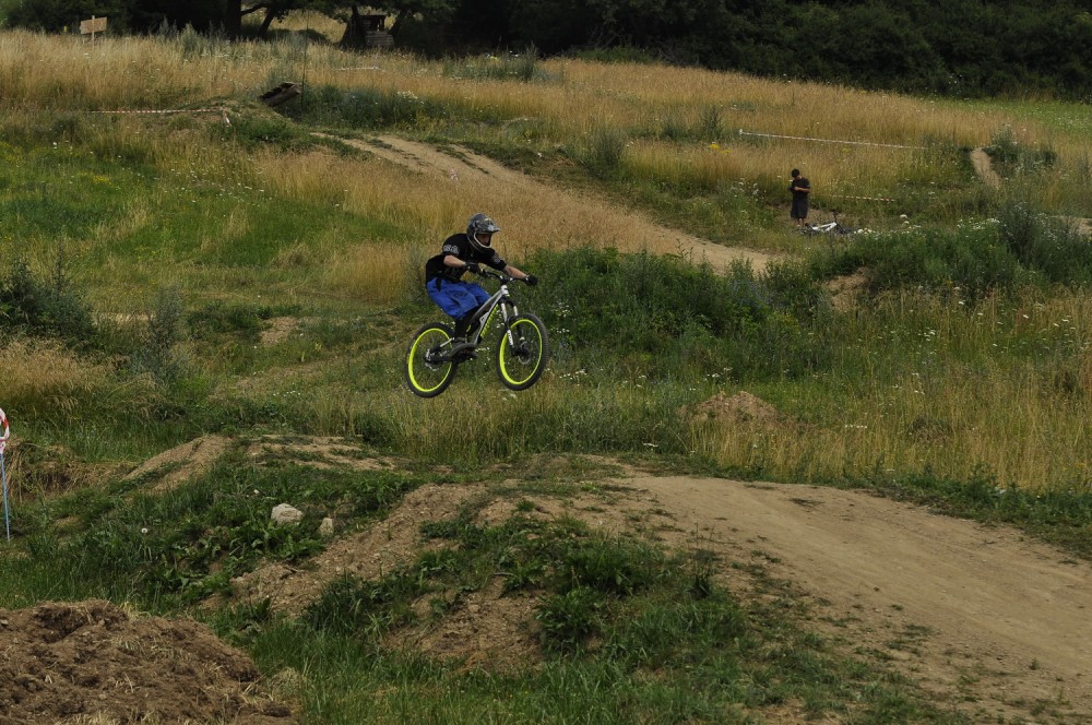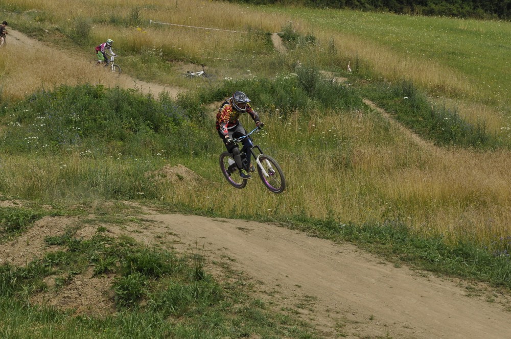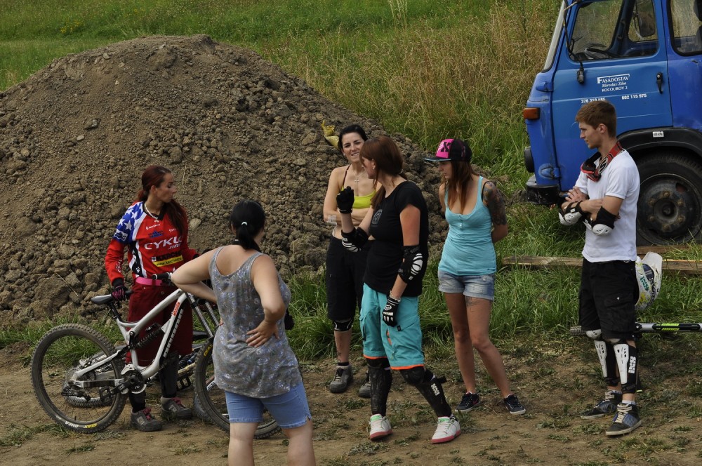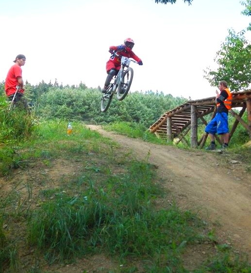 Počasí je luxusní a slibuje mnoho prachu v zavřených klopenkách a spálený ramena. Není nač čekat vyrážíme pomou za lidovku na kopec, který není úplně veliký. Trať je tu jen jedna a co vidím plná dablů, klopenek, něco jako snowboardových skoků, jen vykrojenej zub a dopad z kopce, spíš lehčí, ale zábavná, je tu i pár odstupňovaných dropů a několik větších odpalů, dá se tu docela vyhrát, nebo aspoň mě se tu líbí. Jsme nahoře, (jo mozku tys mě měl ochránit a podívej do čeho zase jdu) ;) nechávám se vést Cruzovo Peťou, holka je to šikovná a zná to tu.
