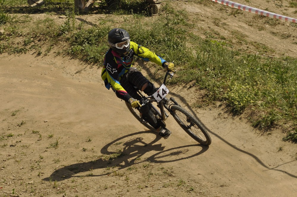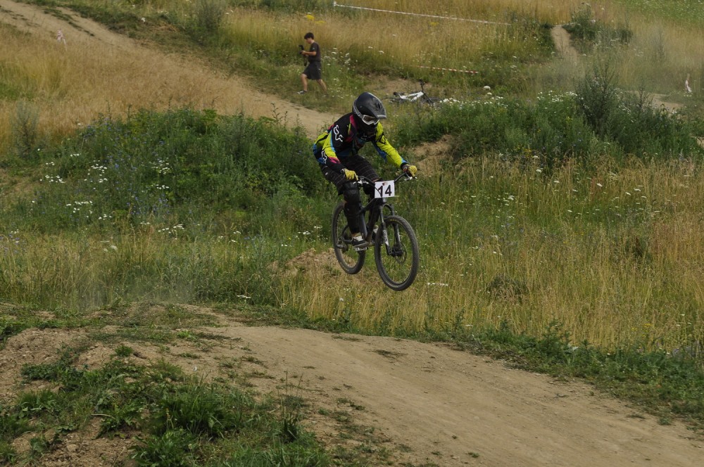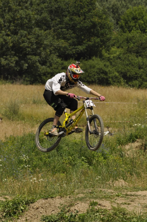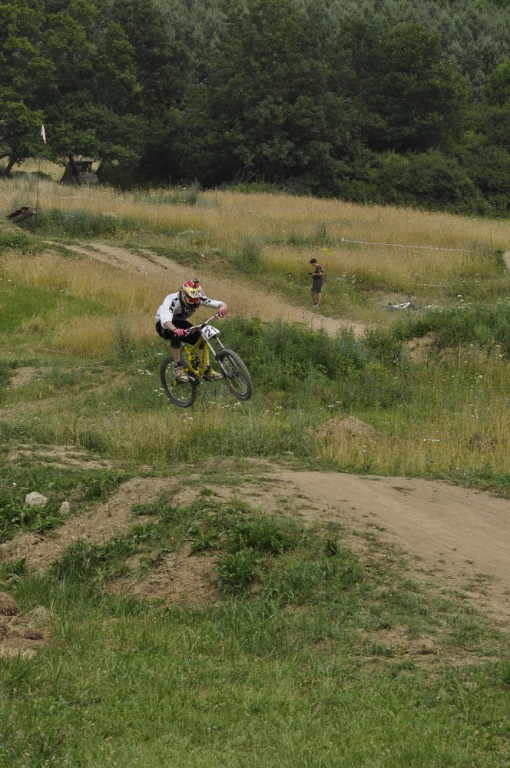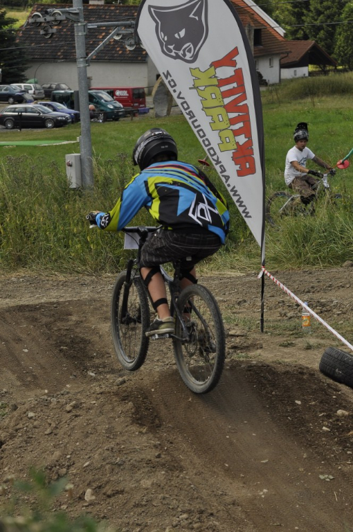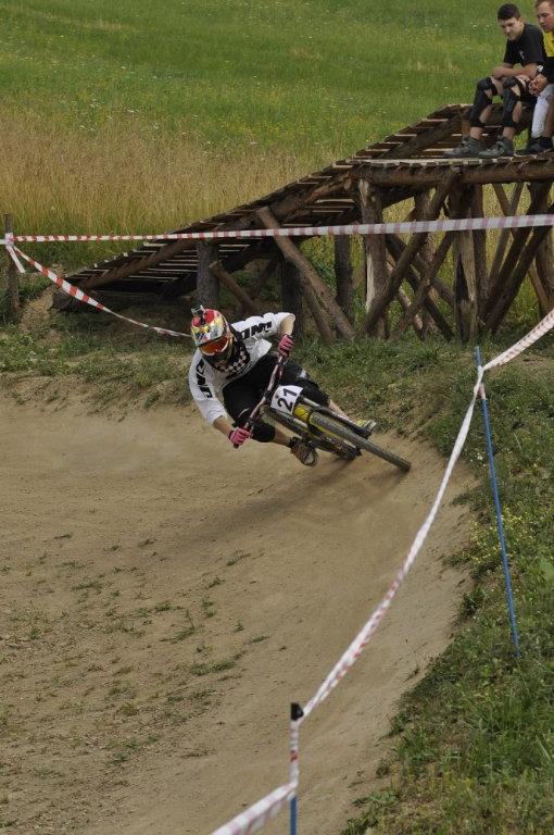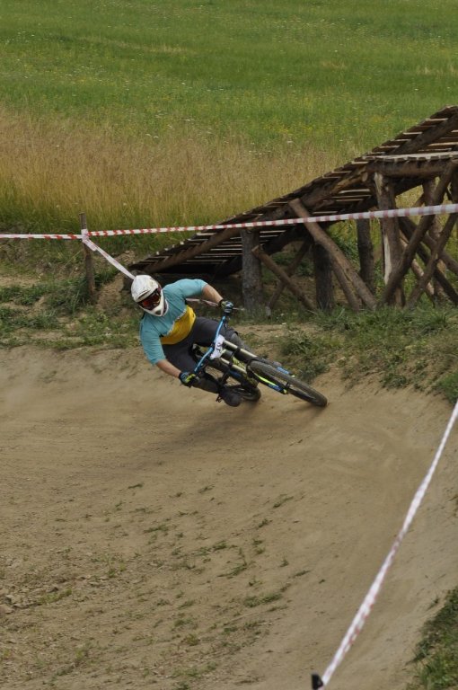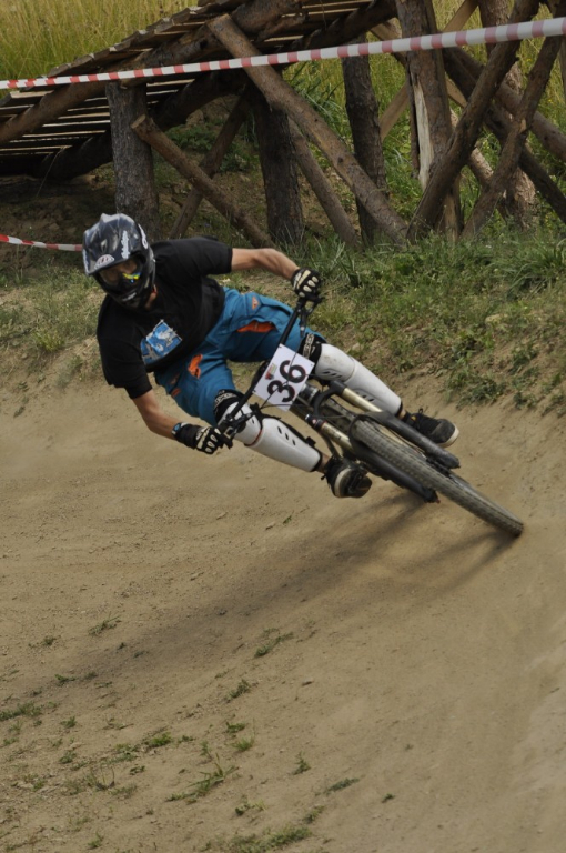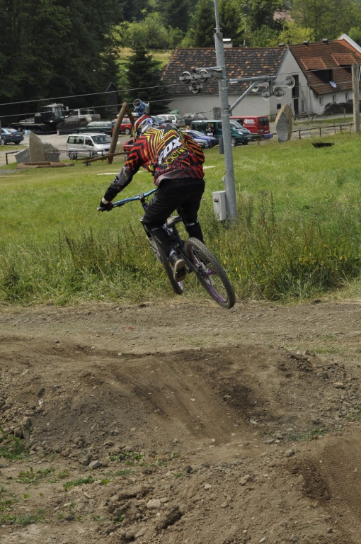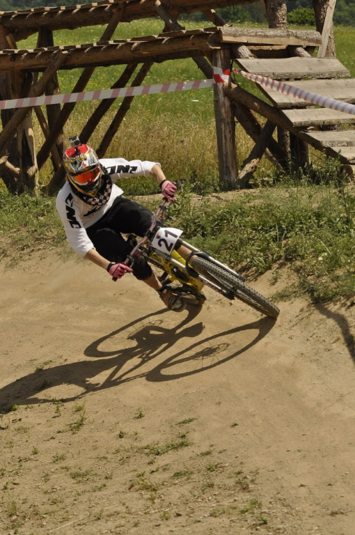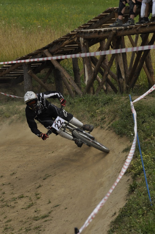 Počasí je luxusní a slibuje mnoho prachu v zavřených klopenkách a spálený ramena. Není nač čekat vyrážíme pomou za lidovku na kopec, který není úplně veliký. Trať je tu jen jedna a co vidím plná dablů, klopenek, něco jako snowboardových skoků, jen vykrojenej zub a dopad z kopce, spíš lehčí, ale zábavná, je tu i pár odstupňovaných dropů a několik větších odpalů, dá se tu docela vyhrát, nebo aspoň mě se tu líbí. Jsme nahoře, (jo mozku tys mě měl ochránit a podívej do čeho zase jdu) ;) nechávám se vést Cruzovo Peťou, holka je to šikovná a zná to tu.
