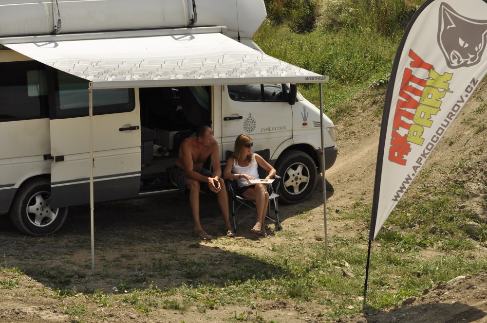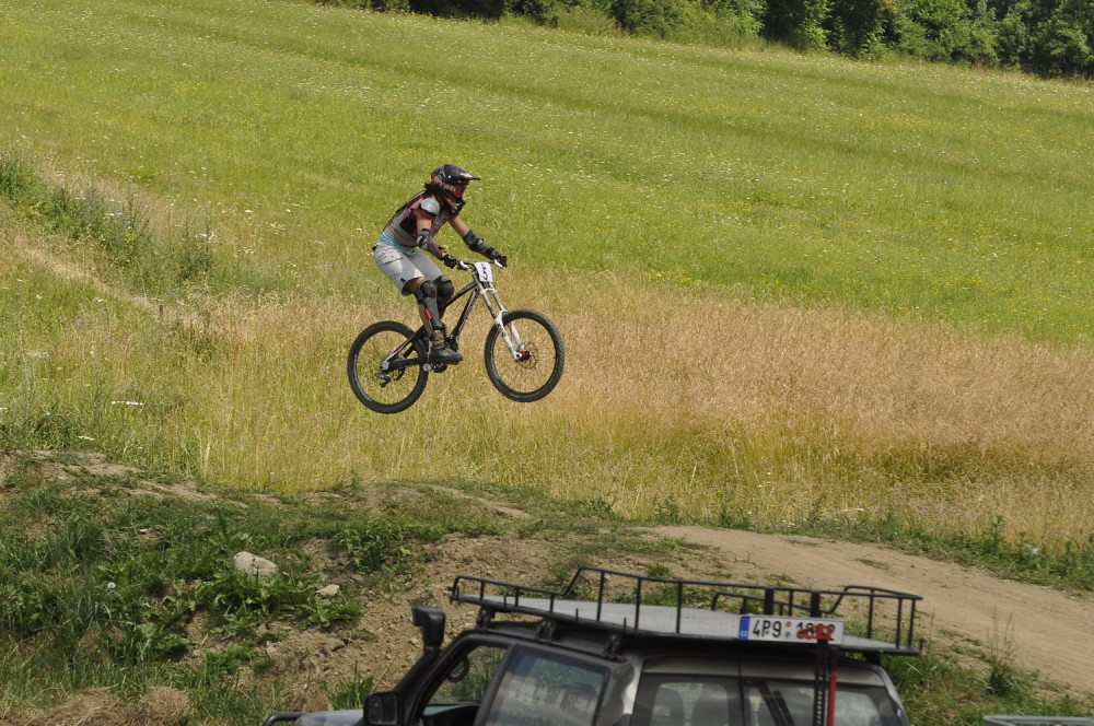 kolo mám první den a jede se mi výborně, cítím, že by to šlo někde míň probrzdit a být rychlejší ale i tak jsem spokojená. A závodníci maj během chvíle odjeto. Vyhlašování je ovšem až v půl sedmé což jistí ještě show na skoku přes Ávii a malej koupák kousek od bikeparku, pár lidí upevňuje trick line, jiní se chladí pivkem, vyžití je tu dosti i bez ježdění, ve kterém můžou všichni ostatně pokračovat, my oblejzáme tak nějak vše :D Dostáváme se k vyhlášení, což je ve velkém stylu – stupně vítězů z čtyřkolky a offroadu, velkolepé. Jelikož jsem si zajela druhý flek smím si podupkat na haupně tereňáku.