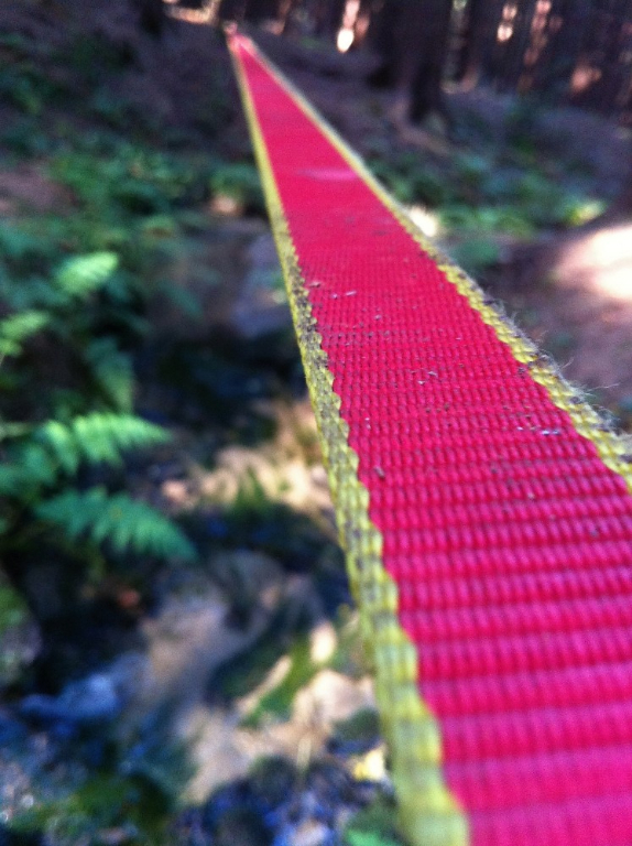 Jasně, je to jak chození po zahradě, nebo v parku, prostě jedna noha, druhá noha.. Ha.. jsem nahoře druhej krok, jak nic, sem v klidu. Krok tři, čtyři.. nuda.. pět.. Volejepodemnouvodaurčitěspadnunaslizkejšutrazlomimsikotník.. Probleskně mě hlavou asi tak v pikosekundě. Oči pak naprosto samovolně v pikosekundě + 1 letěj dolu. Chyba! A jdu samozřejmě k zemi. No k zemi. V tu chvíli mě vlastně dojde, že si teprv to místo kam skočím musím vybrat.. odraz, skok, přistání. No zas taková hrůza to nebyla, ale ten pocit, že jdeš dolů a hledáš si místo, kam musíš skočit je v hlavě dost intenzivní. Jdu teda zpátky na začátek a trochu se mě klepou nohy. Na pátej pokus na to konečně lezu zas oběma nohama a trochu si věřim. Krok, dva, tři.. při pátym kroku se mě zmocní divnej pocit, ale daří se mě ho zahnat naštěstí rychlejc než by Henry Fonda tasil kolty. To soustředění je najedou maximální a já mám v hlavě absolutní koncentraci. Vím, že někde tam za zavřenýma dveřma se tam dusí chut podívat se dolů, radost z toho že jdu a že je to pohoda, ale nic z toho se nodokáže dostat ven, aby mě to jakkoliv ovlivnilo. Očima hypnotizuju konec lajny až nakonec docházím ke stromu na druhý straně. Radost. Seskakuju, dávám si high-five se stromem a jdu to hned potvrdit. Napodruhé už je to pohoda, nebo se tak aspon snažím tvářit.