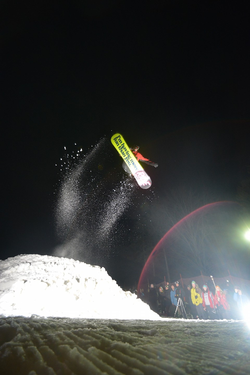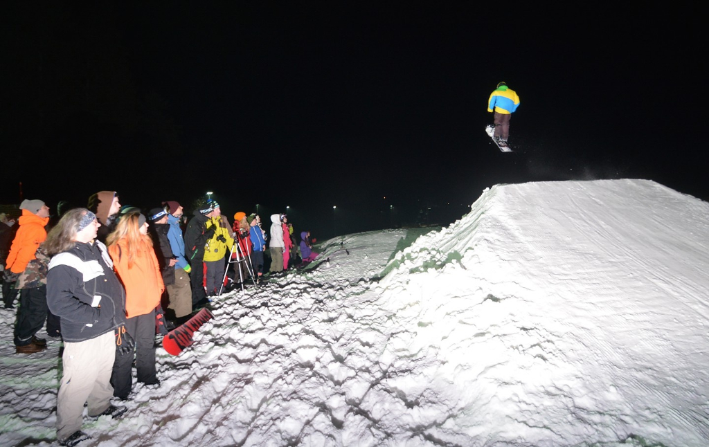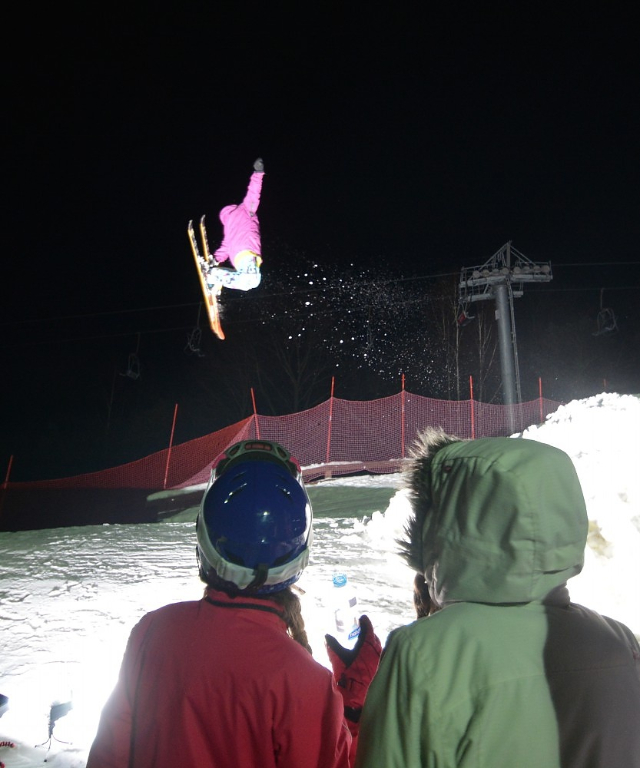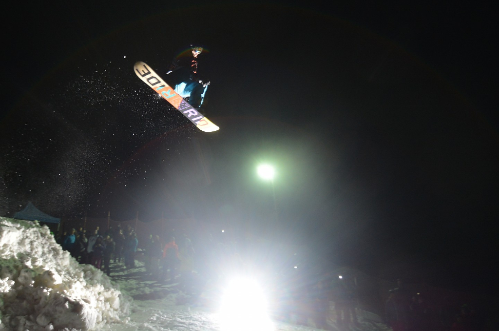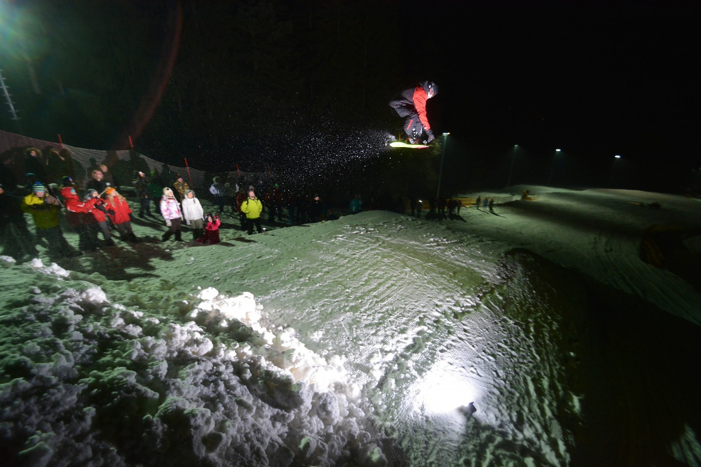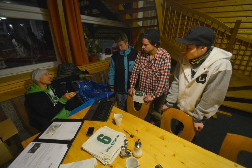 Na devátou hodinu se na sjezdovce vypíná lano a poslední přípravy se rozjíždí. Rolba frézuje dopad ztvrdlej na beton a naopak se snaží zmáčknout sníh na rozjezdu. Staví se stan, rozjížděj se skůtry, co maj tahat ridery nahoru a zahřívá se nejen DJ ale i speakrující Návik. A tak, když je vše připraveno, je tu los o prvního dobrovolníka co to dnes zašle. Teda jasně, včera v noci, těsně po dostavění, to už odpanil Vojta, ale ten tu dnes není – prej bolavá nožička, nebo co a tak největší pankáč, což je místní Mára na SNB rozjíždí tuhle show a hned sklízí zasloužené ovace a pískot od diváků a naopak děsivé výkřiky z hrdel divaček. Po dlouhé diskuzi o rychosti, se na to prostě rozjel od lesa a světe div se, přelítává celej tejbl včetně dopadu a jde až na placku. Tam brutální rozstřel. Nicméně se zvedá a tak si všchni oddychnou, že je ok a že to s tou nájezdovou rychlostí nakonec nebude taková tragédie.