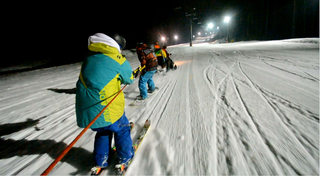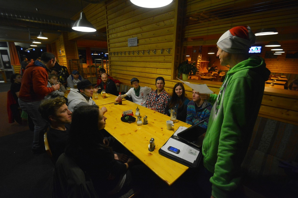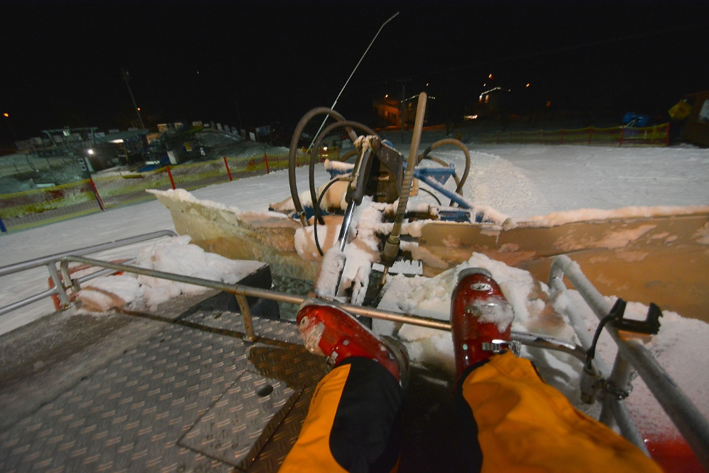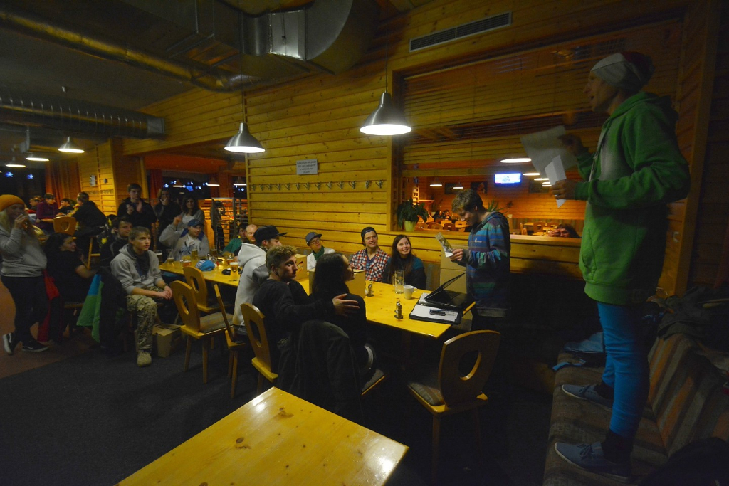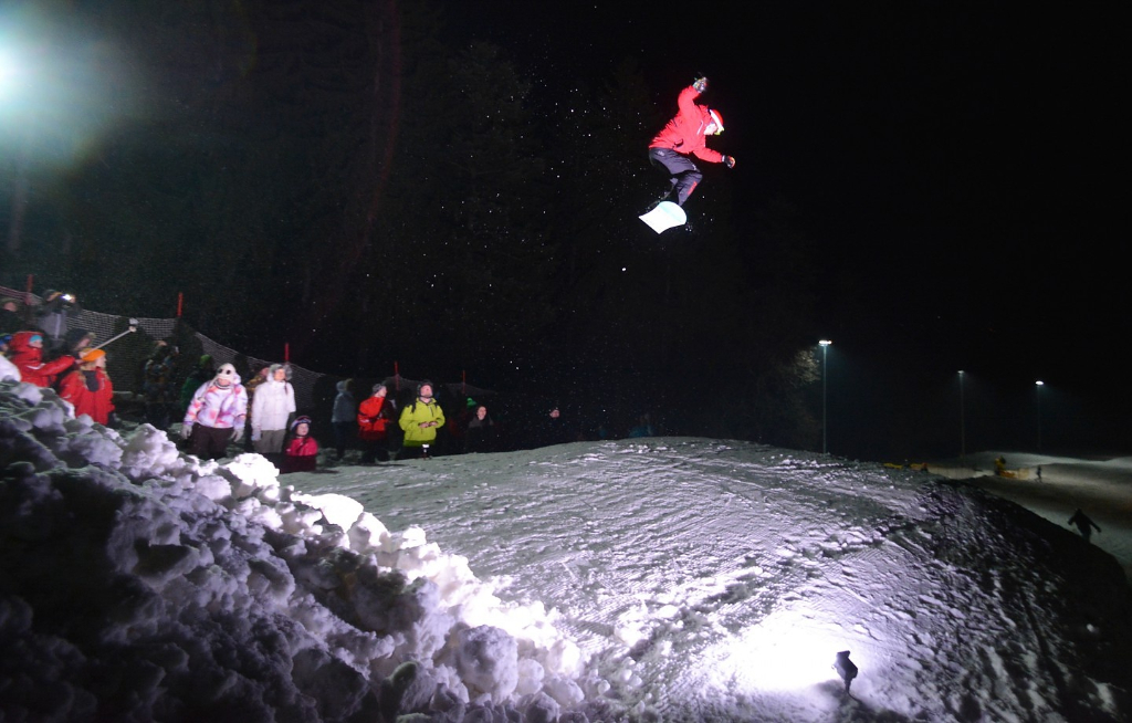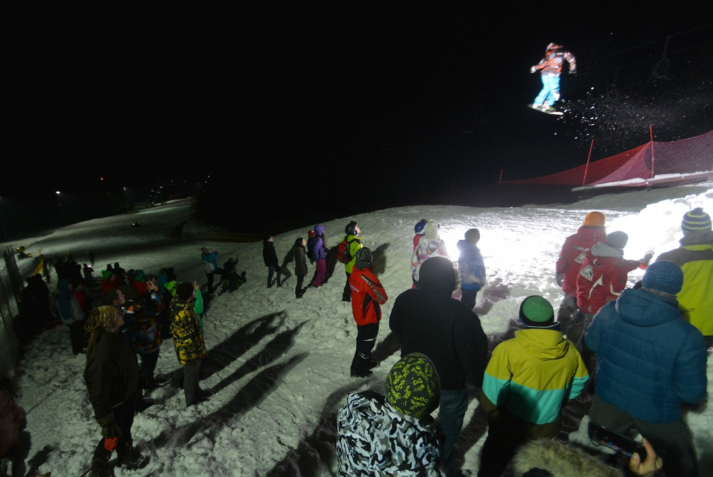 Na devátou hodinu se na sjezdovce vypíná lano a poslední přípravy se rozjíždí. Rolba frézuje dopad ztvrdlej na beton a naopak se snaží zmáčknout sníh na rozjezdu. Staví se stan, rozjížděj se skůtry, co maj tahat ridery nahoru a zahřívá se nejen DJ ale i speakrující Návik. A tak, když je vše připraveno, je tu los o prvního dobrovolníka co to dnes zašle. Teda jasně, včera v noci, těsně po dostavění, to už odpanil Vojta, ale ten tu dnes není – prej bolavá nožička, nebo co a tak největší pankáč, což je místní Mára na SNB rozjíždí tuhle show a hned sklízí zasloužené ovace a pískot od diváků a naopak děsivé výkřiky z hrdel divaček. Po dlouhé diskuzi o rychosti, se na to prostě rozjel od lesa a světe div se, přelítává celej tejbl včetně dopadu a jde až na placku. Tam brutální rozstřel. Nicméně se zvedá a tak si všchni oddychnou, že je ok a že to s tou nájezdovou rychlostí nakonec nebude taková tragédie.
