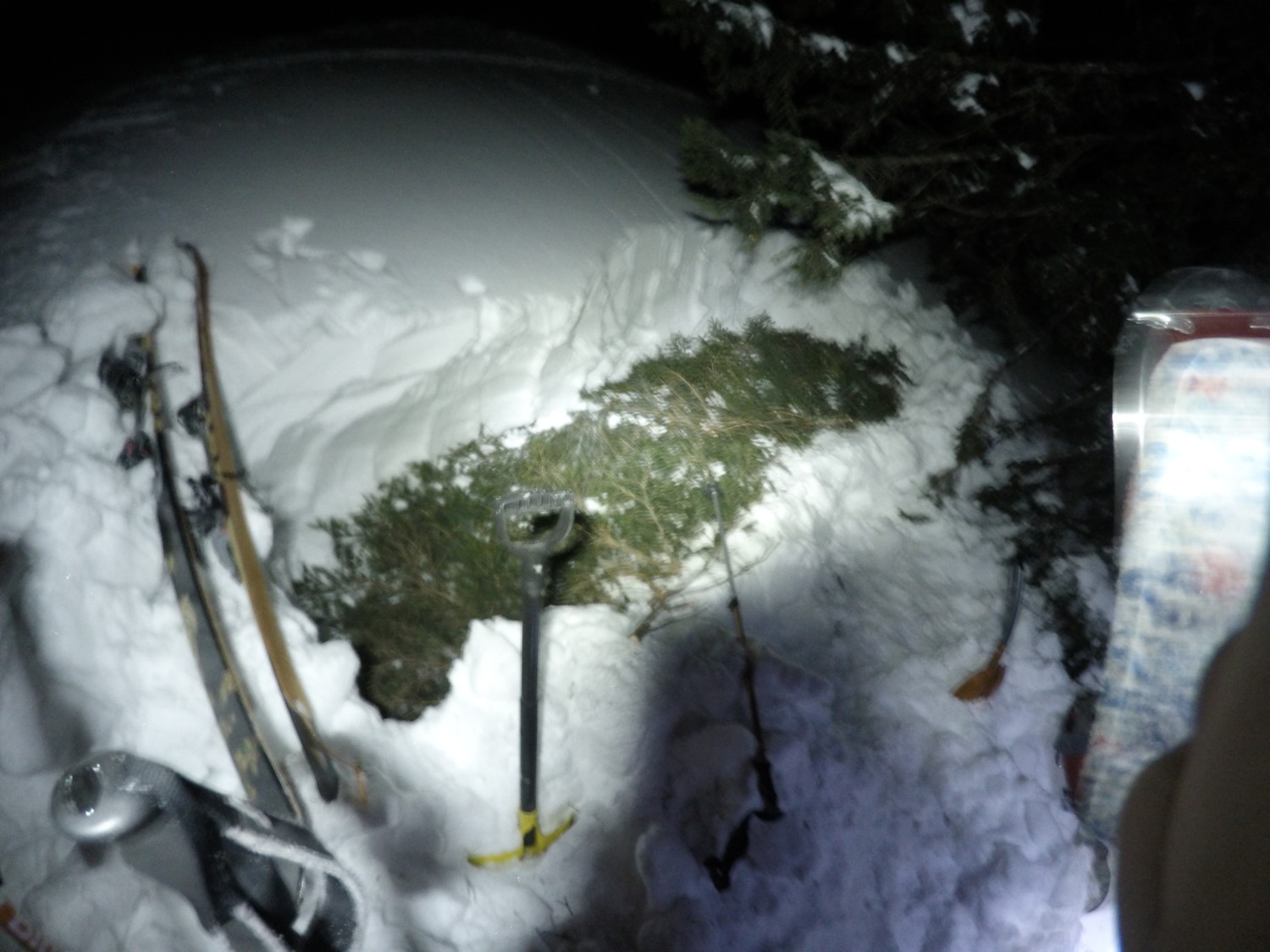 Naštěstí se svítí, tak klepeme na okno. Vychází chlapík, Jirka se ujímá slova, my už myšlenkami uvnitř vaříme. To nám ovšem chlápek hodně rychle vysvětluje, že prostě uvnitř NEIN. Že tam spát nebudeme, ani za peníze, prostě ne. Říká něco ve stylu, že dohoda s Alpenverein byla uzavřená před 30 lety a teď už se na to nehraje. Debata se dost stupňuje, ale stejně prohráváme. V půl 12 v noci, v horách, se spacákem. Obcházíme chatu, že někde v závětří zabivakujeme. Já říkám, že jestli spát někde tady, tak v lese, trochu „ve stylu“. Znovu do lyží a jde se hledat místo, nějaká převějka, kde se půjde zahrabat. Sněhu je málo, ale přeci nacházíme. Lukáš s Jirkou tasí lopaty, já beru pilku a jdu ořezávat větve, ať máme alespoň nějakou izolační vrstvu. Marta rozjíždí kuchyň, aby bylo něco teplého do žaludku. Ešus několikrát koluje a prázdný padá do sněhu, připraven na ranní čaj. Probíráme batohy, co půjde ještě do spacáku, pod spacák atd. Já si jako jediný vkládám do spacáku i vnitřní botičky. A konečně se projevuje výhoda XXXXL hadrů a bunda pod spacákem je lepší jak karimatka Tři hodinky spím bez procitnutí, až mě ve 4 budí lehká zima, trochu s ní bojuju, nebo je to poletující sníh co mi padá do obličeje. Kdo ví.