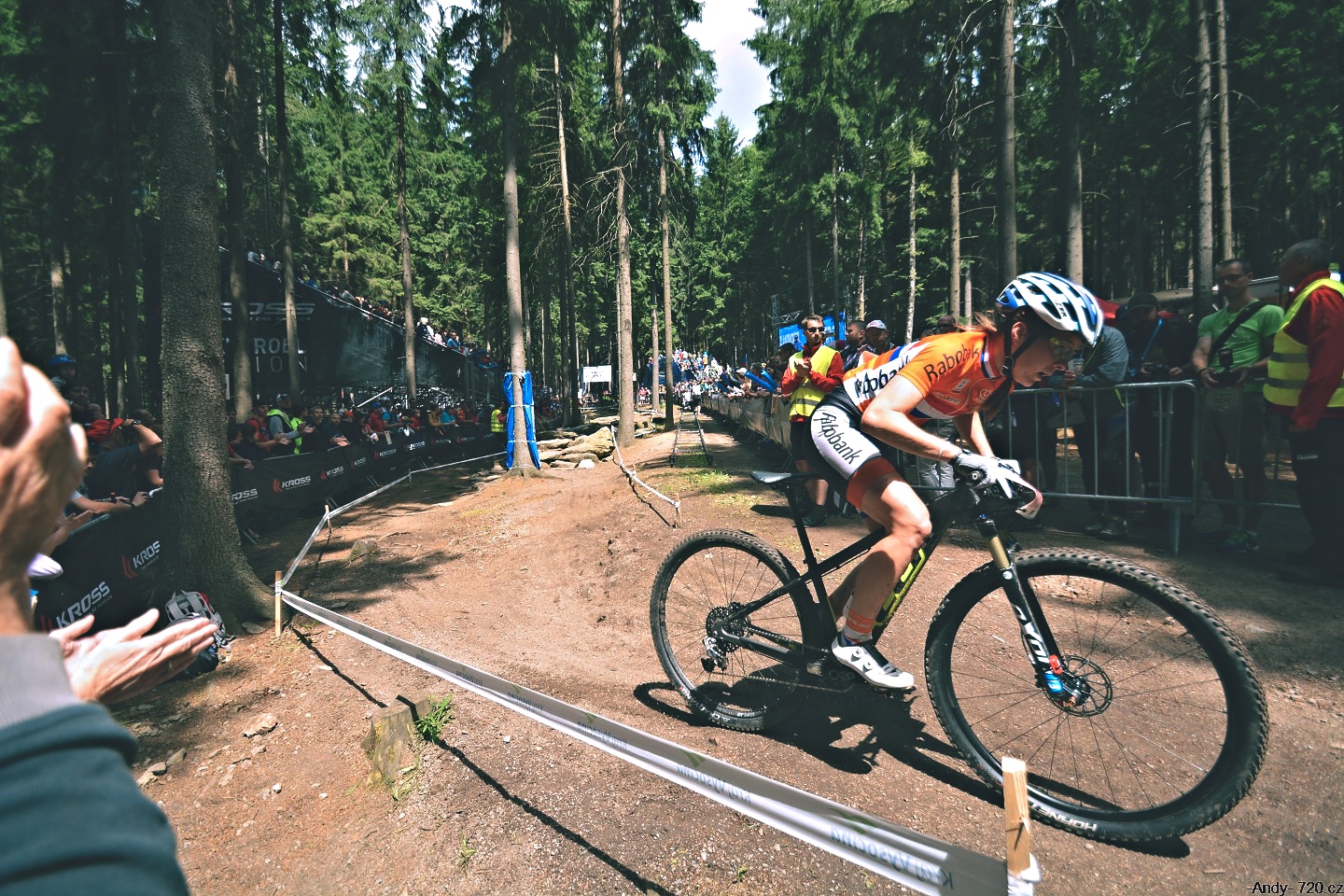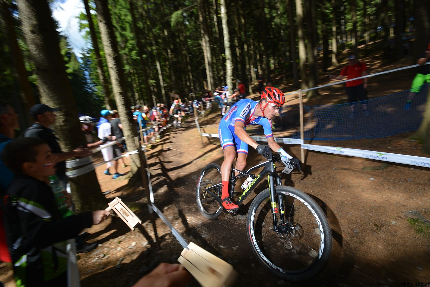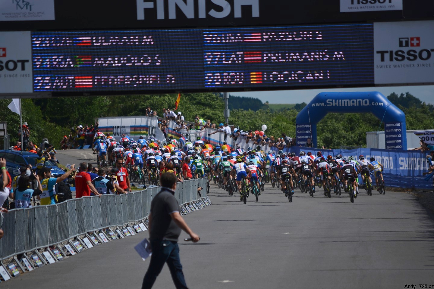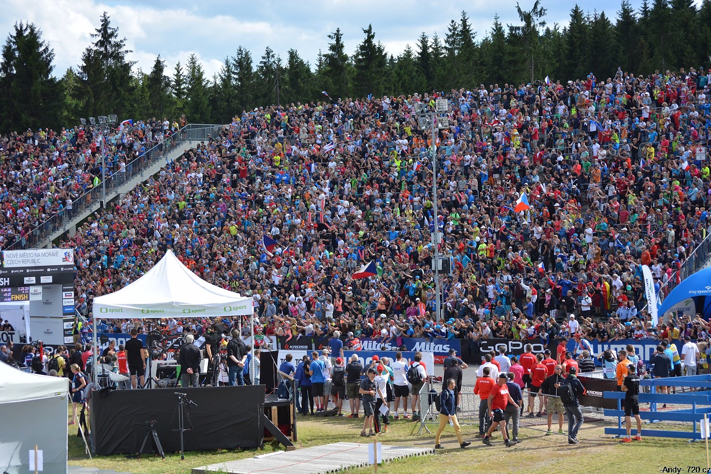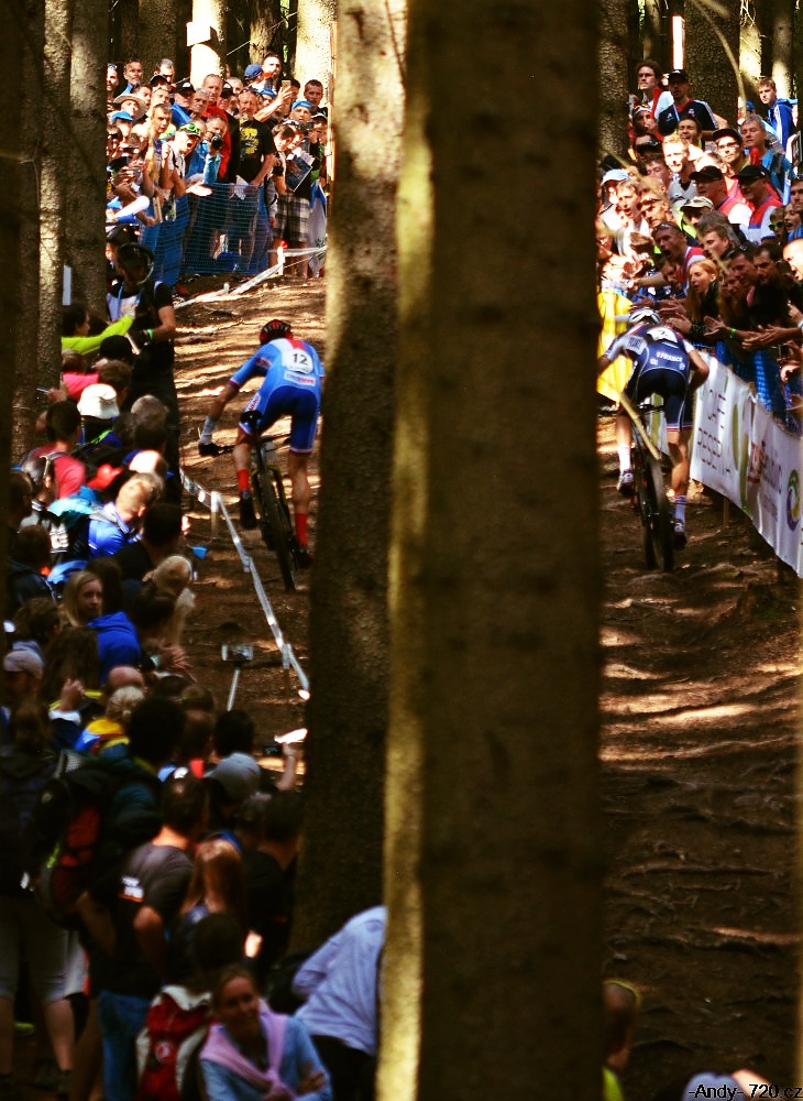 Já si tak kličkuju mezi různýma stanovištěma a cvkám co jde a občas je to takovej zvláštní pocit. Na jedný straně les, kde je tisíce lidí co řvou a fanděj a stačí se otočit o 180°, kde les sice vypadá naprosto stejně, ale tam není noha. Mít špunty v uších – neuvěřitelnej kontrast. Na filizofování ale není čas, protože chlapi už přijížděj do posledního šestýho kola a jak to vypadá, tak Schurter to má v kapse, lidi ale pořád ženou Kulhece i další do maxima. Zážitek prostě neskutečnej a to evidentně nejen pro mě, ale i v depu a mezi UCI se proslýchá, že ve jezdu kraluje jasně atmosférou Fort William a v XCO je to Nový Město.