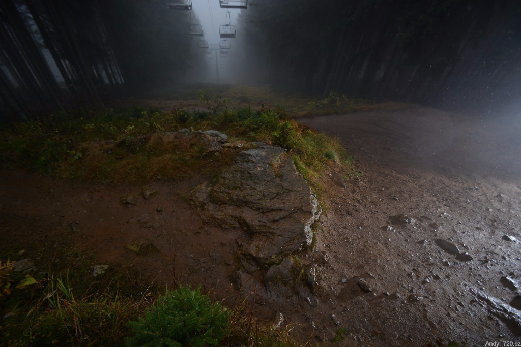 Sedačky co jedou nahoru pak stále spíše zejou prázdnotou, ale nic z toho mě neodrazuje abych nevzal foťák a nedal mu nažrat trochu tý vlhkosti. Místa známý ale pod rouškou mlhy začínaj vypadat dost nevlídně a mlha a voda dělá na všem pěkně kluzkej povrch. Párkrát, i přes to, že tu běhám ve fivetenech, málem hážu záda, ale naštěstí triky nacvičený ze slackliny, mě držej na nohou aniž bych dal foťákem touchdown o nějakej šutr. Kolem se pak začíná prohánět čím dál víc lidí, ale pořád dost z nich stále v nepromokách, takže situace kolem počasí se moc nelepší. Kopec mám skoro schozenej a když navíc zjišťuju, že už je kolem 11hod, není na co čekat. Foťák do auta a jde se jezdit.