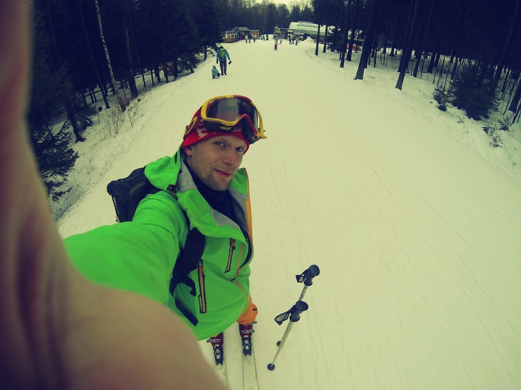 Asi tak po 3/4 hodince jsem nahoře, i se zastávkama na selfíčka a tam hnusno skoro stejný jak dole, jen místo mrholení tu padá mokrej sníh a občas tam mezi mraky i vykoukně ta modrá. Moc se tu ale nezdržuju a jdu utrácet ty nastoupaný metry. To se mě daří celkem rychle a tak jsem za chvíli zas dole, vedle skokanských můstků a je jasný, že tohle bylo prostě moc rychlý. Znova teda nasazuju pásy a mířím vzhůru s tím, že černá sjezdovka vedle můstků je přeci jen taky sjezdovka a barva je jen barva.