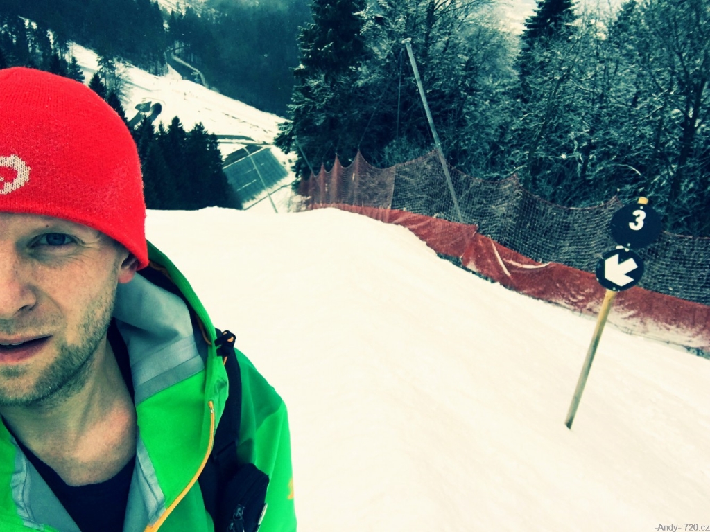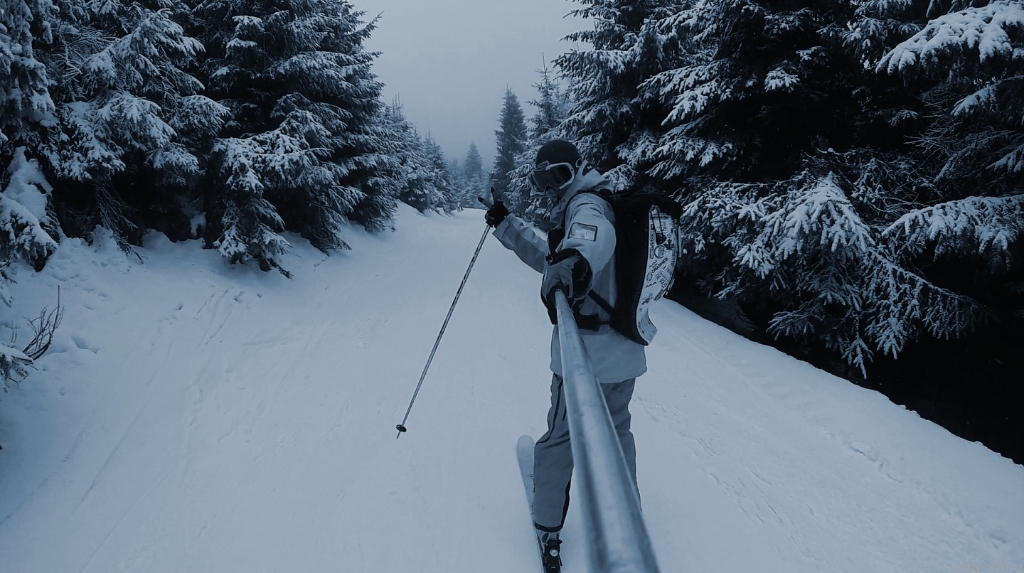 Na víkend jsem sice měl v plánu něco potočit na freedivovym kurzu u Martina, ale to neznamená, že budu celej den den sedět v učebně a čučet do hledáčku, když venku je tak.. jak tam je. Ono totiž třeba k modrý obloze chyběla v sobotu v Liberci nejen ta modrá, ale chvílema i obloha. Mlha se válela už od spodní stanice lanovky v liberecký kotlině a tak dávala vyniknout specifiku tohodle místa. Ať je všude po republice jak chce, tak tady bude skoro vždy jinak. Kotlina si prostě drží svoje klima a Ještěd jak oko mordoru pozoruje svůj kotel a vaří v něm svoje duše. Po úvodních pár minutách natáčení dávám valem čtyřem zdem a navlíkám se z džín do membrány a přeskáčů. A pak už pár kroků přes silnici a k lesu, kde sníh, ač taje, má zatím naprostou nadvládu.