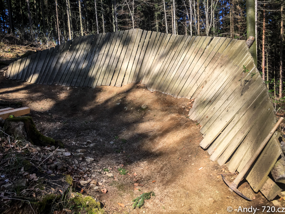 Předně – byla zas brigáda a měl přijet bagr neb nejen na louce je třeba tvořit klopenky, ale i v lese je pořád pěkná paseka. A když kříkám pěkná paseka, myslím to doopravdy. Vítr si vzal přes zimu pár stromů a bohužel jich bylo i pár přímo vedle parkovejch trailů. Výsledek teda je, že trať je v prostřední části nejetelná do doby, než nepřijede bagr a nevyloupne asi tři pařezy. Sešli jsme se teda s Vlkem v sobotu v komorní sestavě a rozsekali aspoň to, co po polmech zůsatlo stát..
