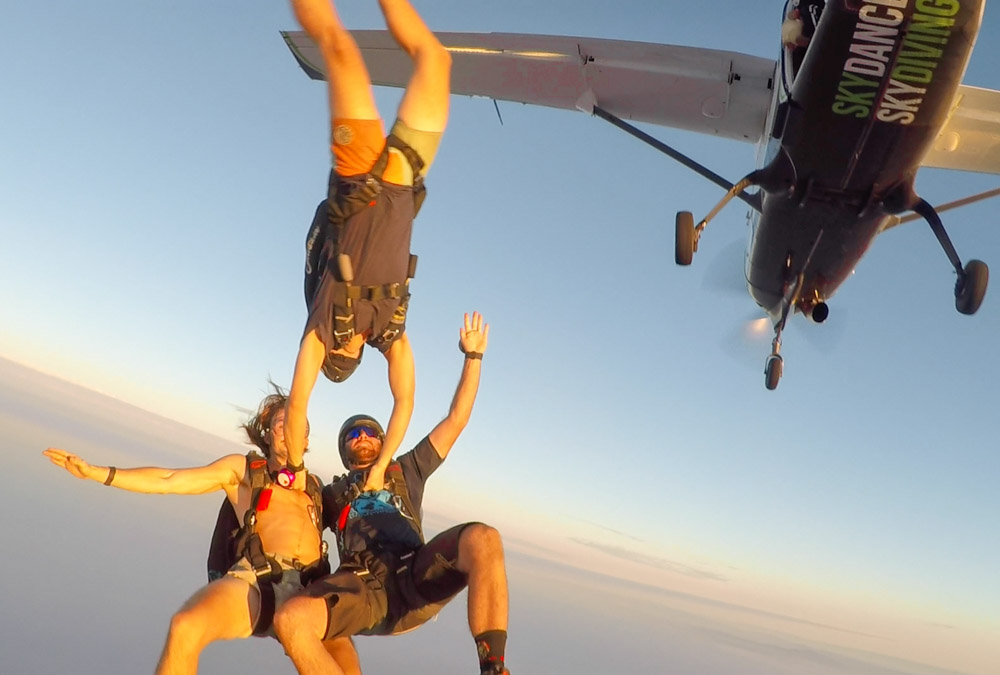 Zacina druhy tyden. Ja uz muzu skakat sam, umim si padak aj zabalit, takze mi nic nebrani zapojit se do zdejsiho stereotypu. Vetsina zamestnancu bydli primo na Drop zone. At uz v kontajnerech, predelanejch na bydliky, nebo v camprech. Christ ma u svyho camperu velkou zed z repraku. Clovek je to s velmi rozmanitym a dobrym hudebnim vkusem. Definitivne prispiva k celkove atmosfere zony velkou merou. Kazde rano presne v 8:00 zacina den znelkou z Lvyho krale Circle of life. Uz si ani neridim budika. Vylejzame, mala snidane, do hangaru nachystat vejbavu, rozcvicka apod. V 9 uz sedime v letadle a behem par minut sme nahore. Ja trenuju svuj zaverecnej skok – zkouska. Proto vetsinou zacinam svuj den double frontflip ze dveri do double backflip. Pak zalezi na nalade. Bud naky 360, nebo tracking. Kdy si date ruce podel tela a jako Iron man litate sem a tam po obloze. Tohle se opakuje cely den. Posledni seskok dne se pak dela pri zapadu slunce. Toho se ucastni jen lidi tady odsud. Piloti se toho taky nebojej. Vetsinou jim staci tak 1/3 runway. Tentokrat vsak dava plnej a vyuziva celou delku. Na konci ma rychlost na rozdavani, bere za knipl a uz letime kolmo vzhuru. Do vseobecneho vesely se zpivaj pisne typu “If you’re happy clap your hands”. Pred vyskokem jako vzdy si placnout se vsema skokanama, poprat si hezky let a vyskakat ven. Nekdo uziva volny pad, nekdo otvira hned po vystupu a uziva si zapad slunce. Dole pak uz ceka nekdo s krabici piv, zaslouzenou odmenou po super dni. Party tu jsou tez divoke. Muj prvni vikend dorazilo dost lidi. Popijime v kempu, kdyz v tom prichazi holcina, ze prej party na runway. Kdyz se ptam co s sebou, rika ze jen pivo, vic netreba. Prichazim na runway a zde 6 buchet a 3 typci, vsichni uplne nahy. Dochazi mi co myslela tim ze mam donyst jen pivo:-D lidi tu zkratka nic moc neresej. Uzivaj si zivot naplno. Nevadi jim bydlet ve stanu a zrat konzervy. Jediny na cem zalezi je skakat a bejt stastnej. Hodne mi to pripominalo zacatky bikingu u nas. Kdy sme byli mala komunita, vsichni se znali, nikdo nic neresil, jen se jezdilo.