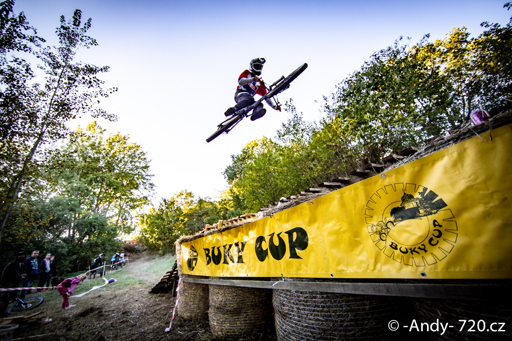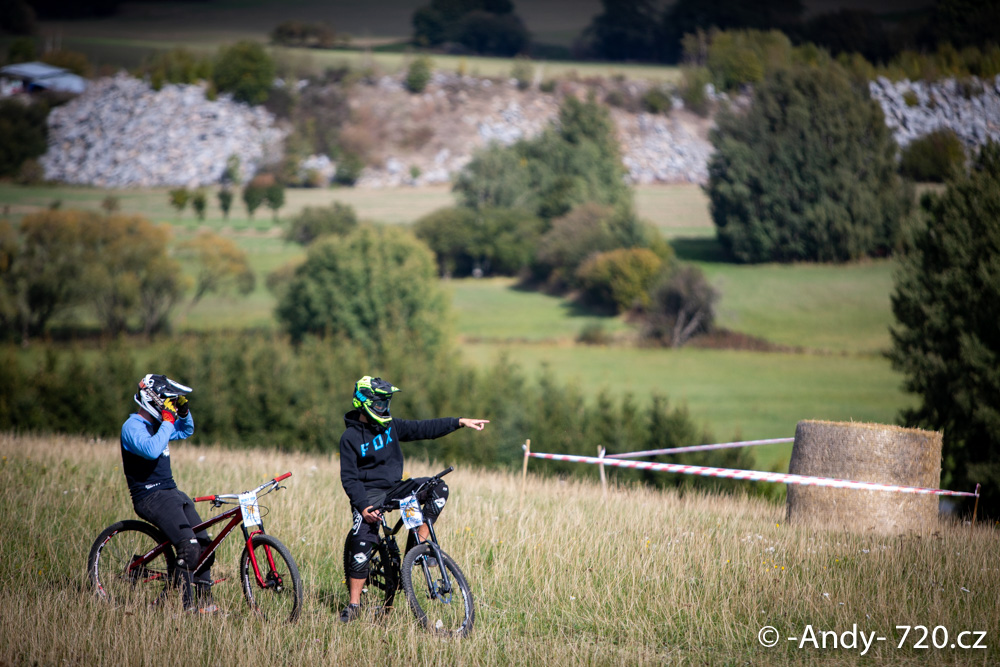 Na místo ale dorážíme nakonec v pohodě asi půl hoďky poté, co vypukly tréninky. Beru chránítka, kolo a už se hrnu na trať. Balíky slámy, nějaký mlíko, pár palet.. tohle bude legrace! Tlačenkuju nahoru a tam regulérní starej starťák na dual. Tvl – tak teď tedy fakt nevim, jak se to tu pojede. Nicméně najíždim na oči první trať a – HA! Dřevěnej drop na příšlap, sice není velkej, ale fakt jsem ho nečekal. Pak už si dávám bacha, takže rock-garden a-lá Krakonošova zahrádka, mě tolik nepřekvapuje. V cíli už jen punkskok přes balíky slámy a fotobuňka.