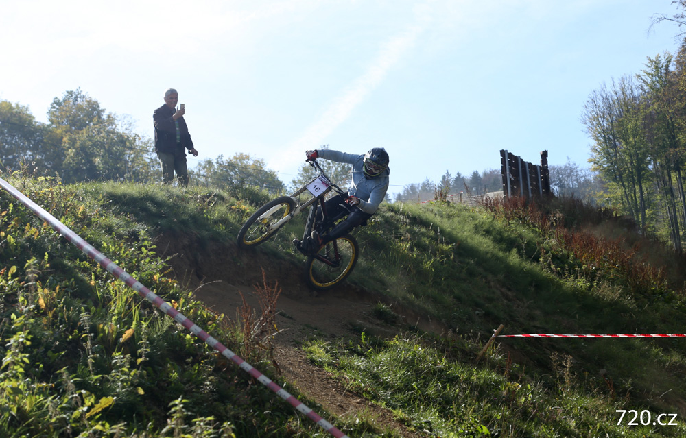 Časy startů jsou pro všechny přesně danný a visej u lanovky, no a já v cíli jen klikám na stopky a zapisuju. Vše by se to dalo, jen je blbý, že pár jezdců má čísla omotaný kolem řídítek, na šikmo, nebo v kole, takže dovolávat se na někoho, kdo to vlastně je, je trochu kompliké, no a cílem pak projíží pořád dost lidí i mimo pořadí. Jo – sypu si popel na hlavu, občas je to fakt honička uhlídat, jestli ten, kdo jede, je závodník, nebo někdo z druhý půlky startovního pole a jen si chce ještě potrénovat a jestli tedy mám klikat, nebo co. Budem to prostě muset na příští sezonu nějak vychytat – jen ty ceny za pronájem časomír jsou teda peklo, inu uvidíme..