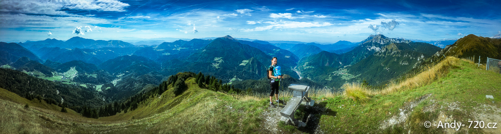 Spodní část se celkem dá, pak se ale sjezdovka přivostří a výraz kolmice začíná nabírat doslovnosti. Teda furt je to travnatá louka, ale stromy kolem se zmenšujou, až mizej úplně a tráva začíná klouzat. Cestou tedy několik zastávek, ale nakonec jsme po 45min slušnýho workoutu a čumění metr před sebe do trávy, nahoře. Hele easy to nebylo, hlavně pro Hannie, která si neviděla díky Jonášovi v nosítku pod nohy, ale to, co se otvírá nahoře, za tu dřinu rozhodně stálo. Včerejší soutěska byla sice pěkná, ale pořád s ní mám spojenou pachuť 9€ vstupnýho. Tohle nás sice stálo o dost víc úsilí, ale bylo to zadarmo a ty výhledy? Ach! K nezaplacení..