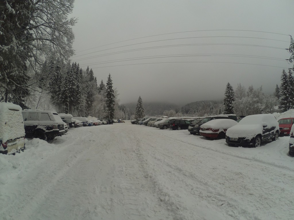 Cesta ubíhá bezproblémově, slunce pomalu rozsvěcuje zasněženou krajinu a pohodovým tempem dojíždím do Špindlu na parkáč, kde mám sraz s Frysákem.