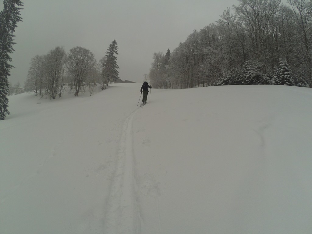 Dostávám instrukce, že mám dělat větší mezery, kdyby náhodou. Lavinovka je na 2, ale celou noc jemně sněžilo a dole na parkáči padal mokrej sníh, tady v 1100m je asi 5cm novýho, pak cenťák krusta a pod tim něco co kdysi byl prašan.