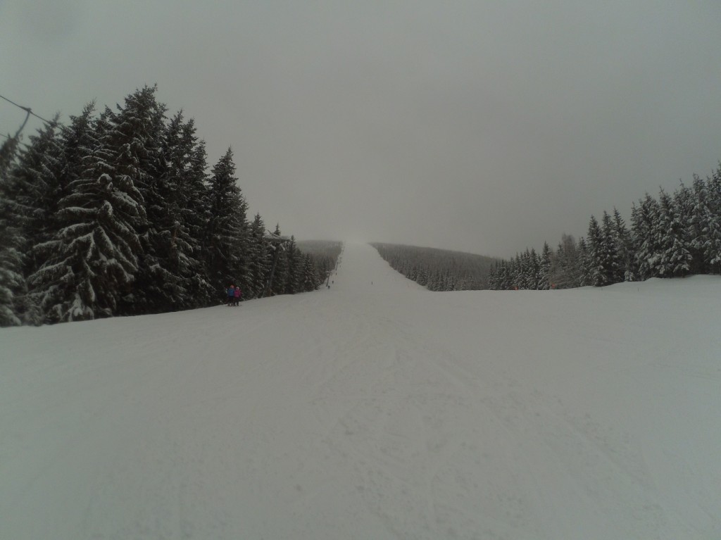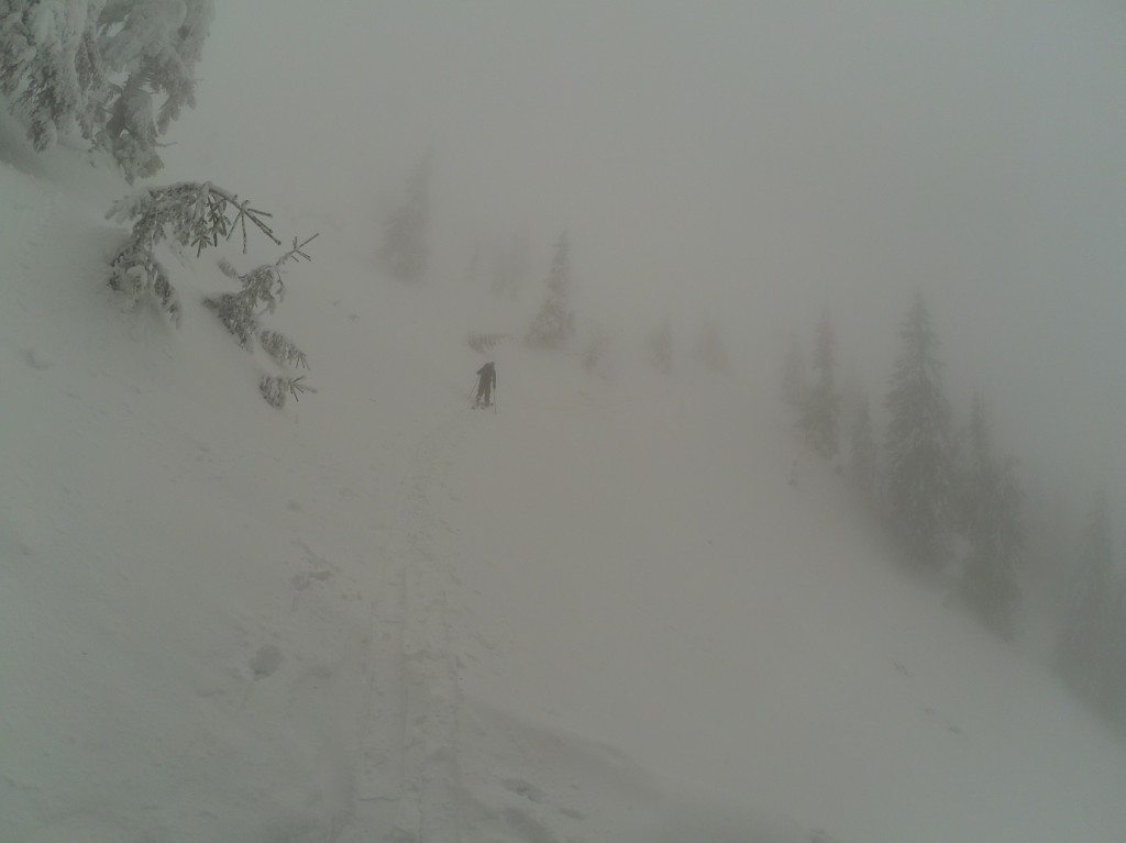 Párkrát kontrolujem mapu, jestli jdem dobře. Míjíme hotel Horal a dál po Judeichově cestě, ale chceme na starou Bucharovu cestu, takže to natraverzujem a trochu nejistě pokračujem po červený TZ, moc vidět není. V lese to ještě jde, ale když se dovlečem na otevřený svahy, zhorší se viditelnost tak na 50m a začínaj lavinový pole.
