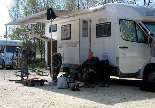 Tak v pátek sme se u mě na parkovišti sešli se Sloupobijcem a čekáme na Petra Heiníků, kterej nás hodlal ubytovat v karavanu. Kolem 19h přiletěl, my tam naložili kola a tunužrádla, a odletěli jsme směrem k hranicím, na železnou rudu, a Regen, až asi kolem 22h přistáváme v Gaiskopu. Tady už na nás čeká beach party, páč kluci – Drahoš, Carlos a další kucí vybrali parkoviště s luxusním bílým písečkem, šli jsme grilovat a kolem 2h i spát.