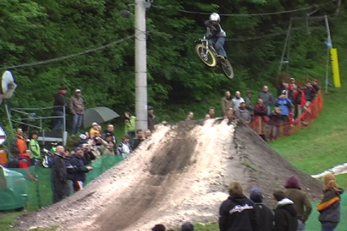 Na DH – vyvážení nahoru truckama. Dodávky s otevřenou korbou, a sprintery se skříněma. Ale výjezd trval jen chvilku, takže ok. Dole ovšem strašná fronta, asi na půl hodiny, no vopruz. A sme nahoře. Dáváme první kukaččí jízdu, Andy zvyklej z našeho na skoky (nedejbože doubly) tak chudého českého poháru tam bez kouknutí nepochopitelně vyšle jeden ze skoků, leč ten má za sebou 3m díru, kde Andy končí :) Dobrá práce.